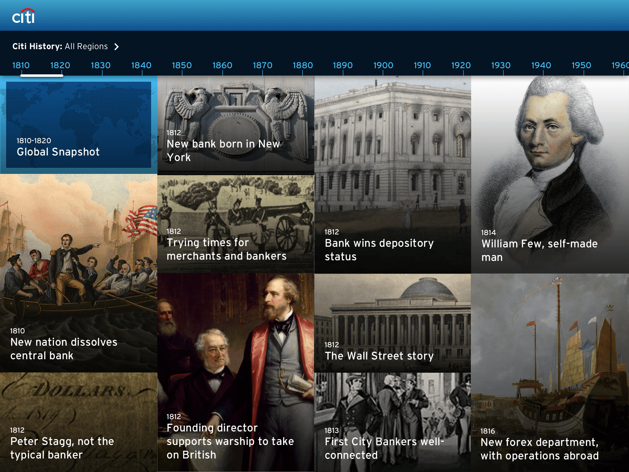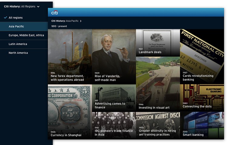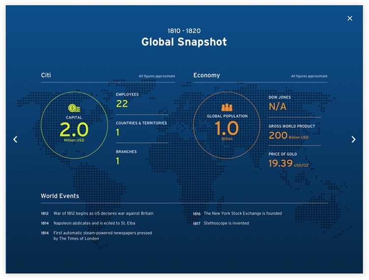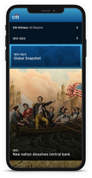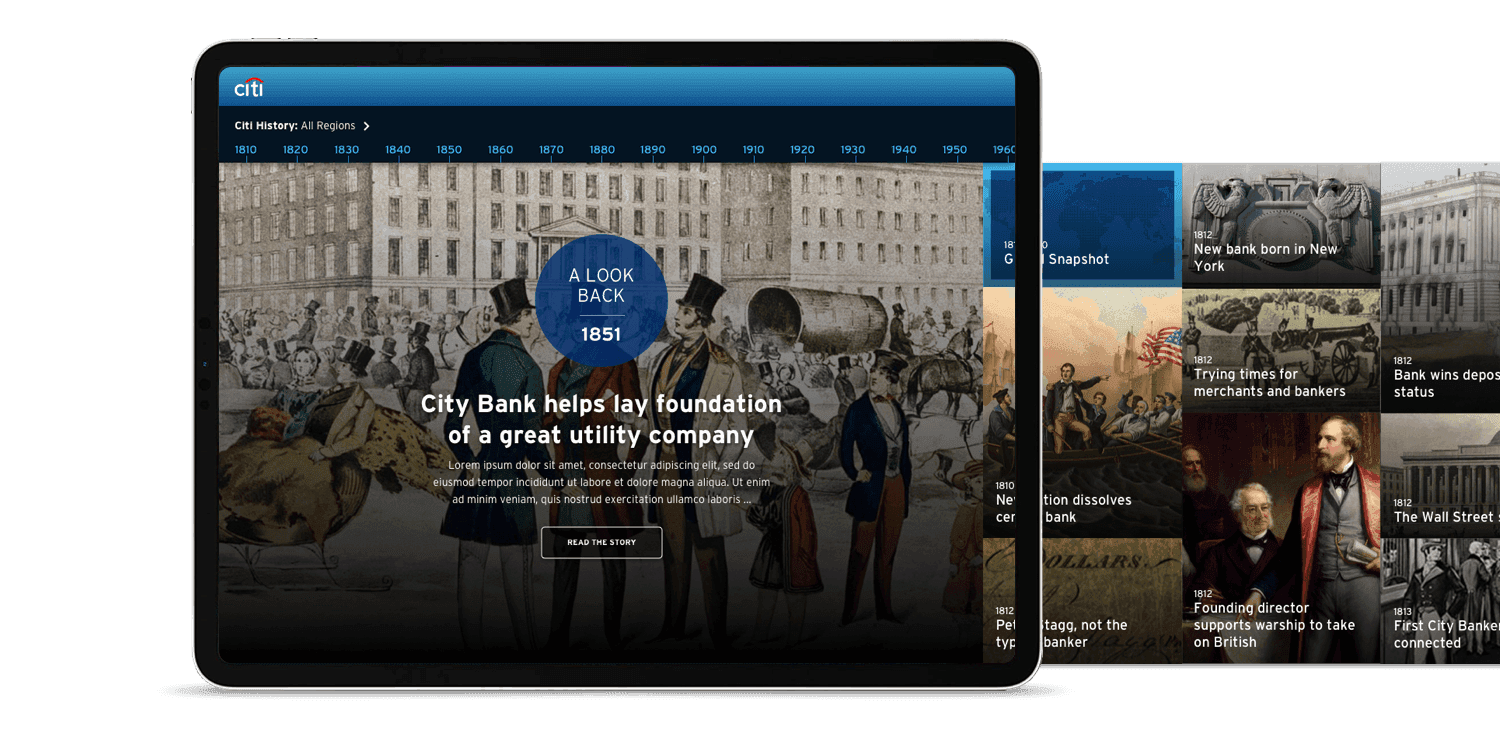 Citibank, a global financial institution born in 1812 in NYC, wanted to create an engaging timeline to highlight the company’s history. I lead design focusing on creating an engaging experience to help tell Citibank’s rich heritage.