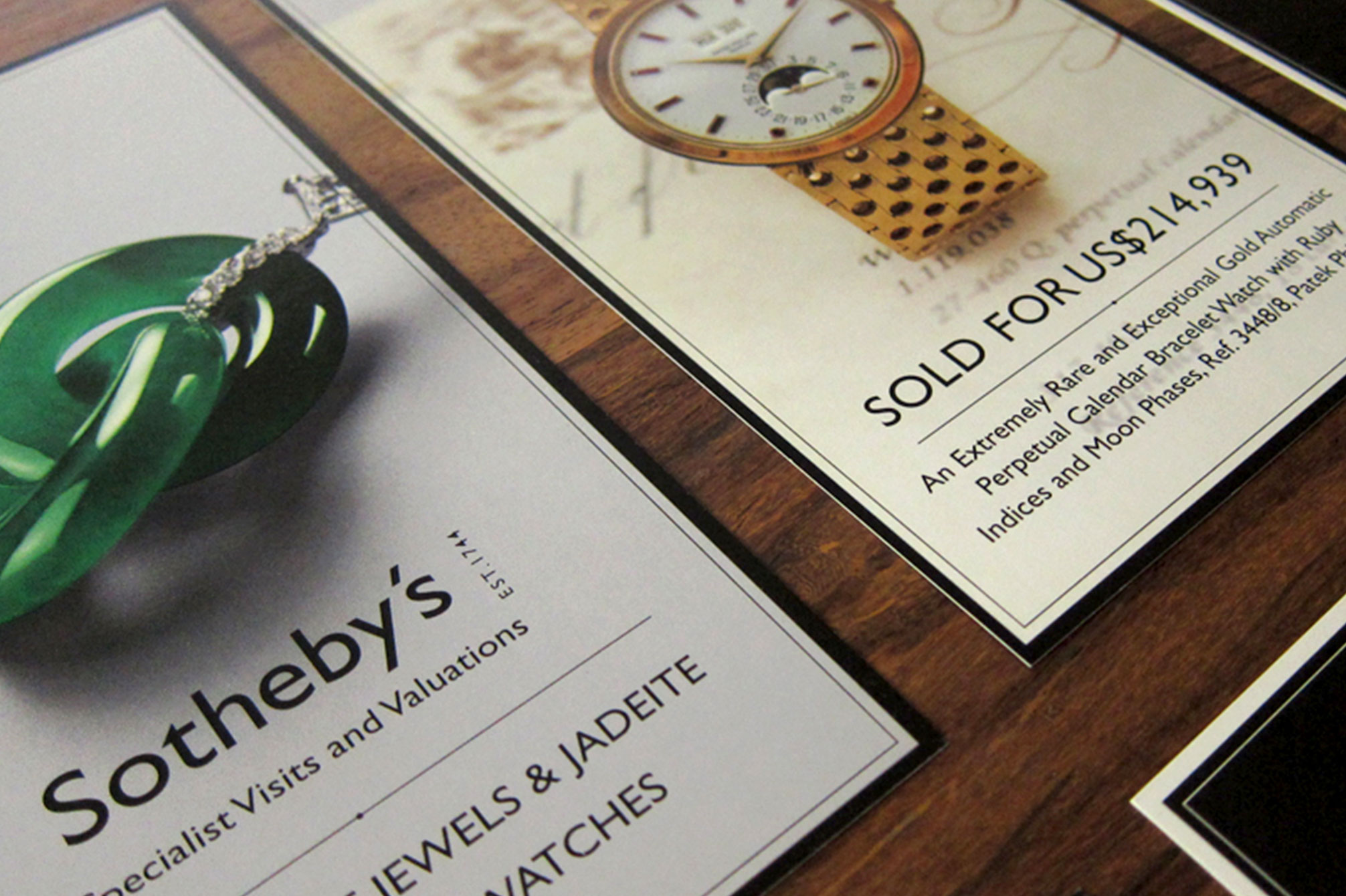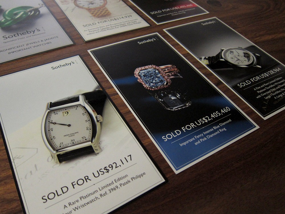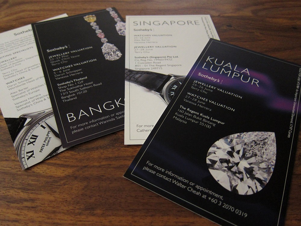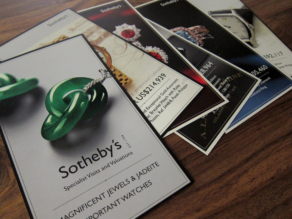 An set of cards for Sotheby's to announce upcoming specialist visits and valuations of jewels and watches across the Asia Pacific region, highlighting items that have sold and their final prices.