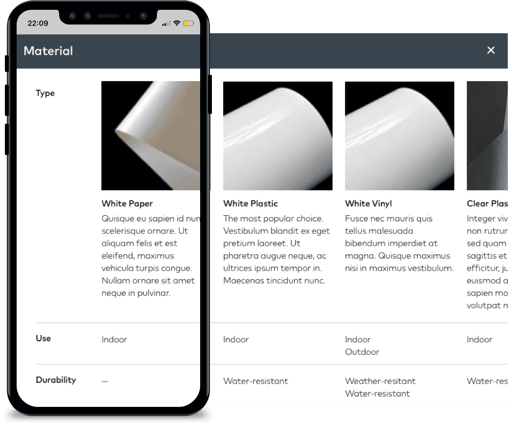 Seeing designs first was not a possibility due to technical constraints. To work around this, I broke up configuration choices, starting with just two. This also enabled product information to have more visibility. Having less upfront decisions reduced roadblocks, decision overload, and bounce rate.