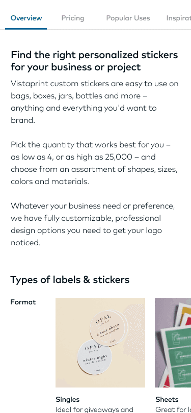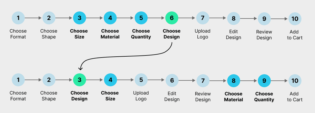 Research revealed overall friction, lack of clarity, and poor information hierarchy. Additionally, parts of the flow had different product owners with their own priorities and goals, making it difficult to achieve a cohesive experience. saw a low order completion rate of 0.8–9% across their Labels & Stickers vertical.