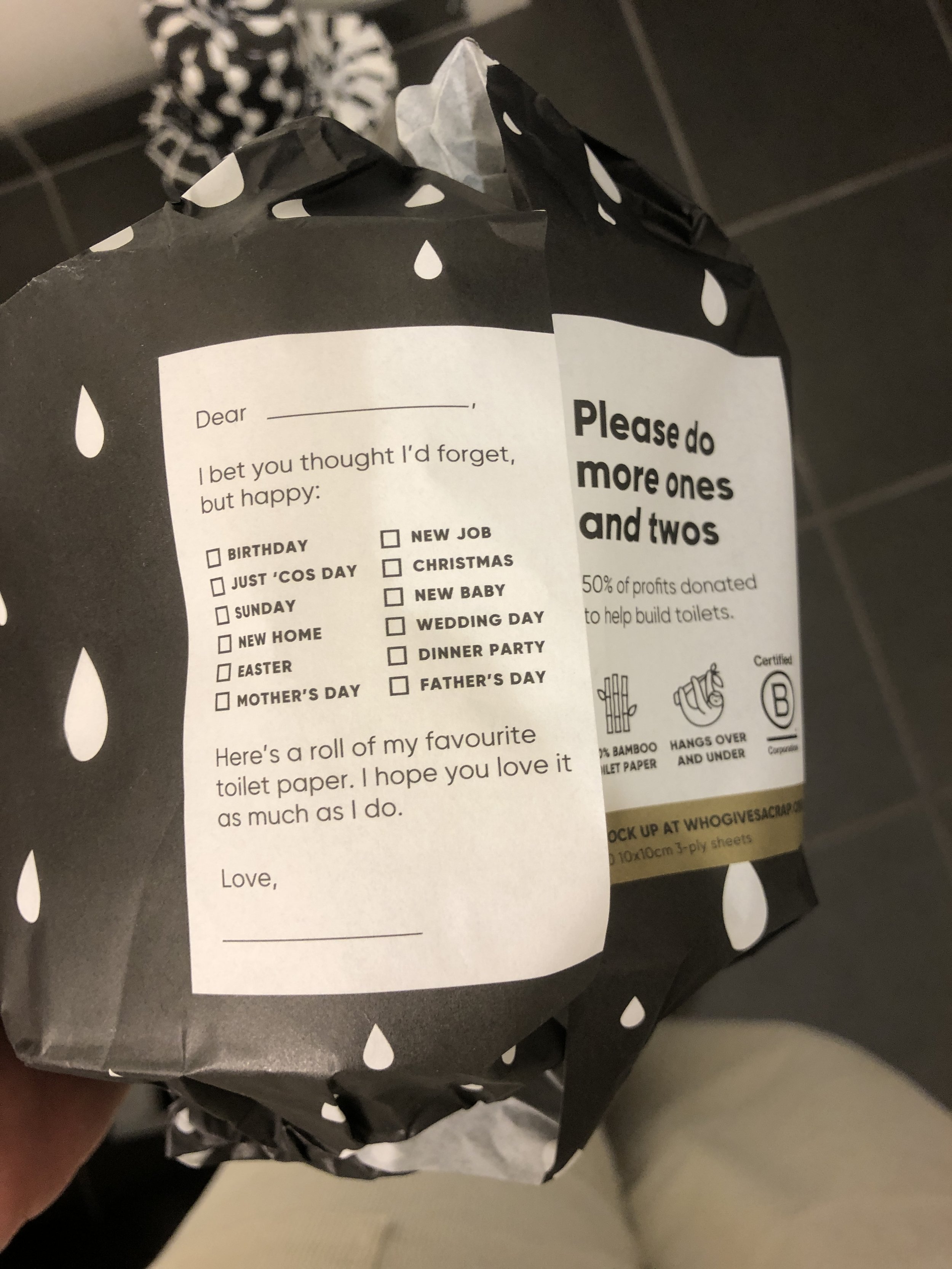 Unwrapping reveals more copy, sometimes fun, sometimes weaving in the facts about their mission. One roll’s wrapper pointed to the website for a trivia quiz to do while on the loo, and another had copy about gifting the roll with a checklist of different reasons including “birthday”.