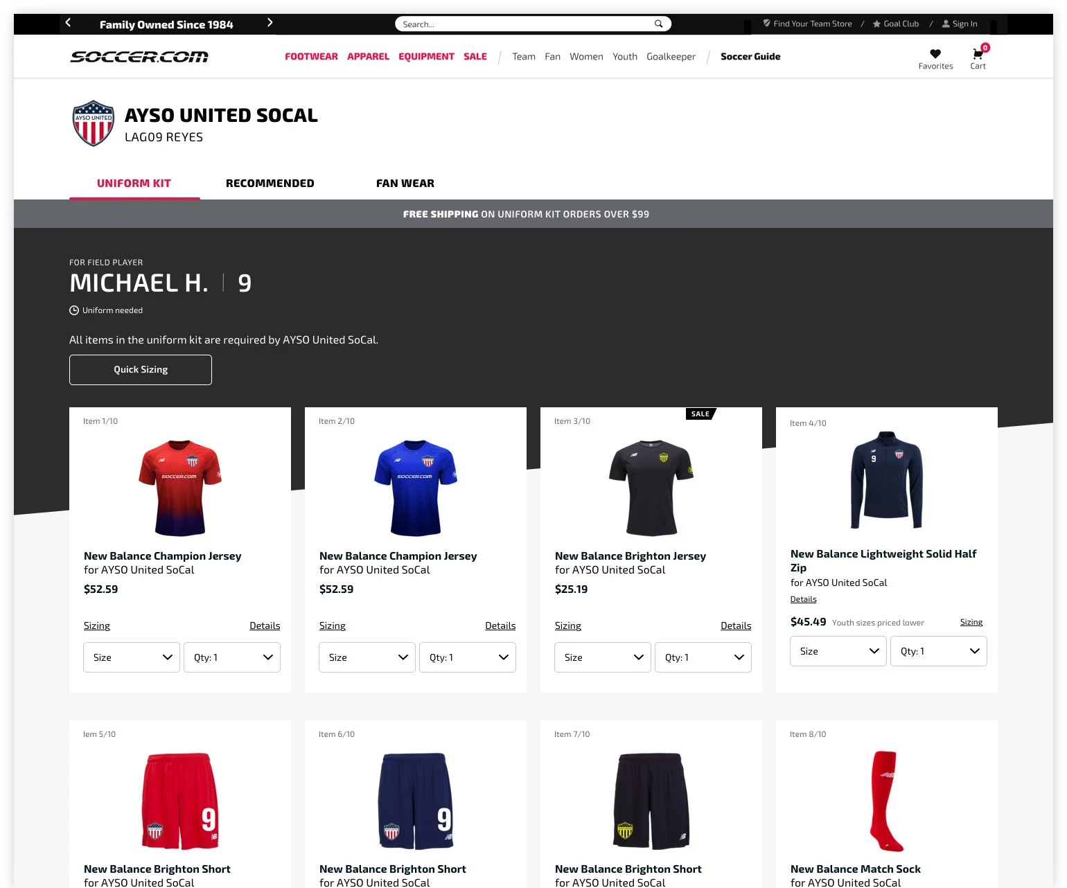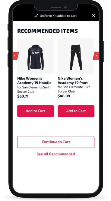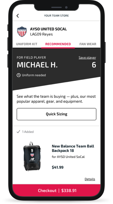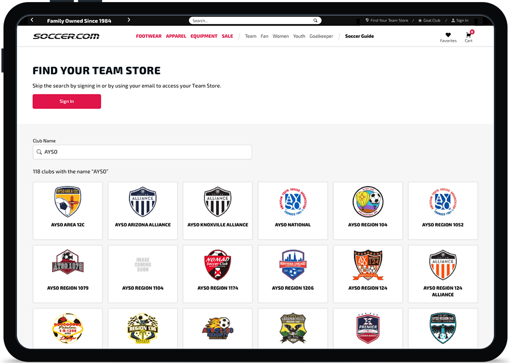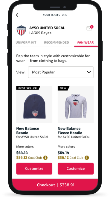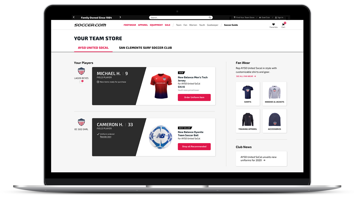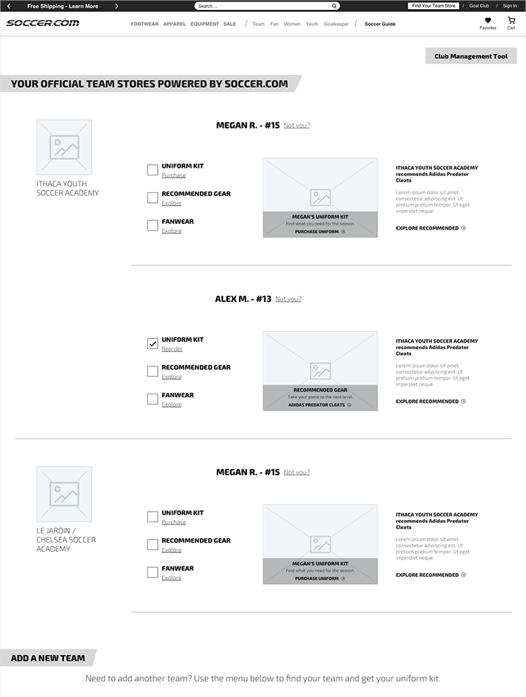 “Your Team Store” was a new area for Soccer. There would be a dashboard which included links to the uniform, recommended products, and fan wear.
