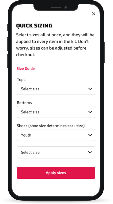 Because uniforms kits could contain a lot of items, Soccer wanted to give customers options to help speed up ordering. Quick Sizing would enable the customer to select sizes at once for all the products, instead of selecting a size one by one, per item.