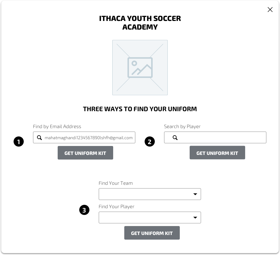 Initial wires had offered all three ways to search for team uniforms — all at once, without guidance. I proposed separating these search methods into two distinct pathways, which also reinforced Soccer’s preferred search hierarchy of finding uniforms by email first.