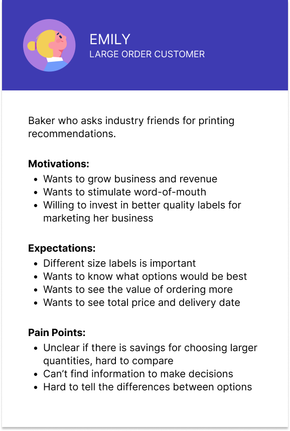 Testing the new Labels & Stickers design with small business owners, they were able to accomplish finding what they wanted, understood choices, and were able to complete configuration without hesitation. They appreciated information like cost per unit and details on materials and finishes.