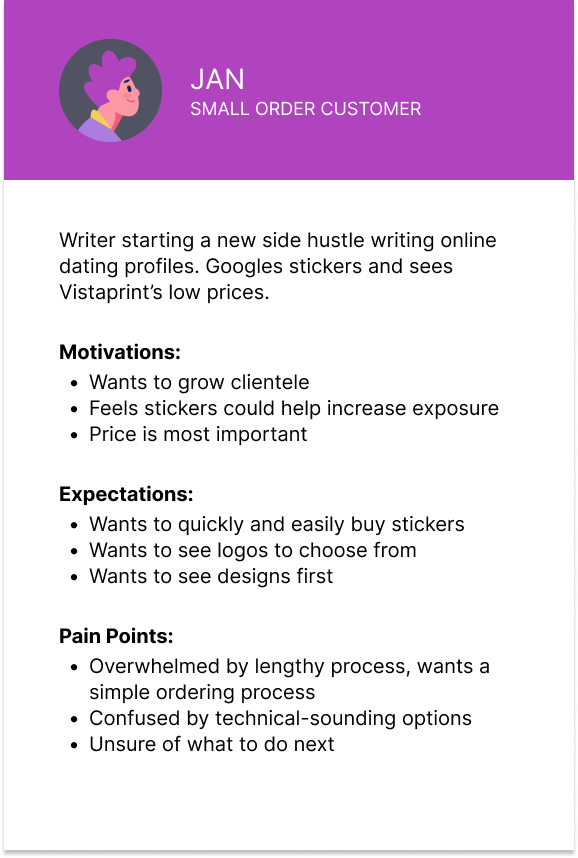Small business owners. Based on Vistaprint’s data, I created two personas to reference throughout the project, to ensure design would align with customers' motivations, behaviors, and expectations.