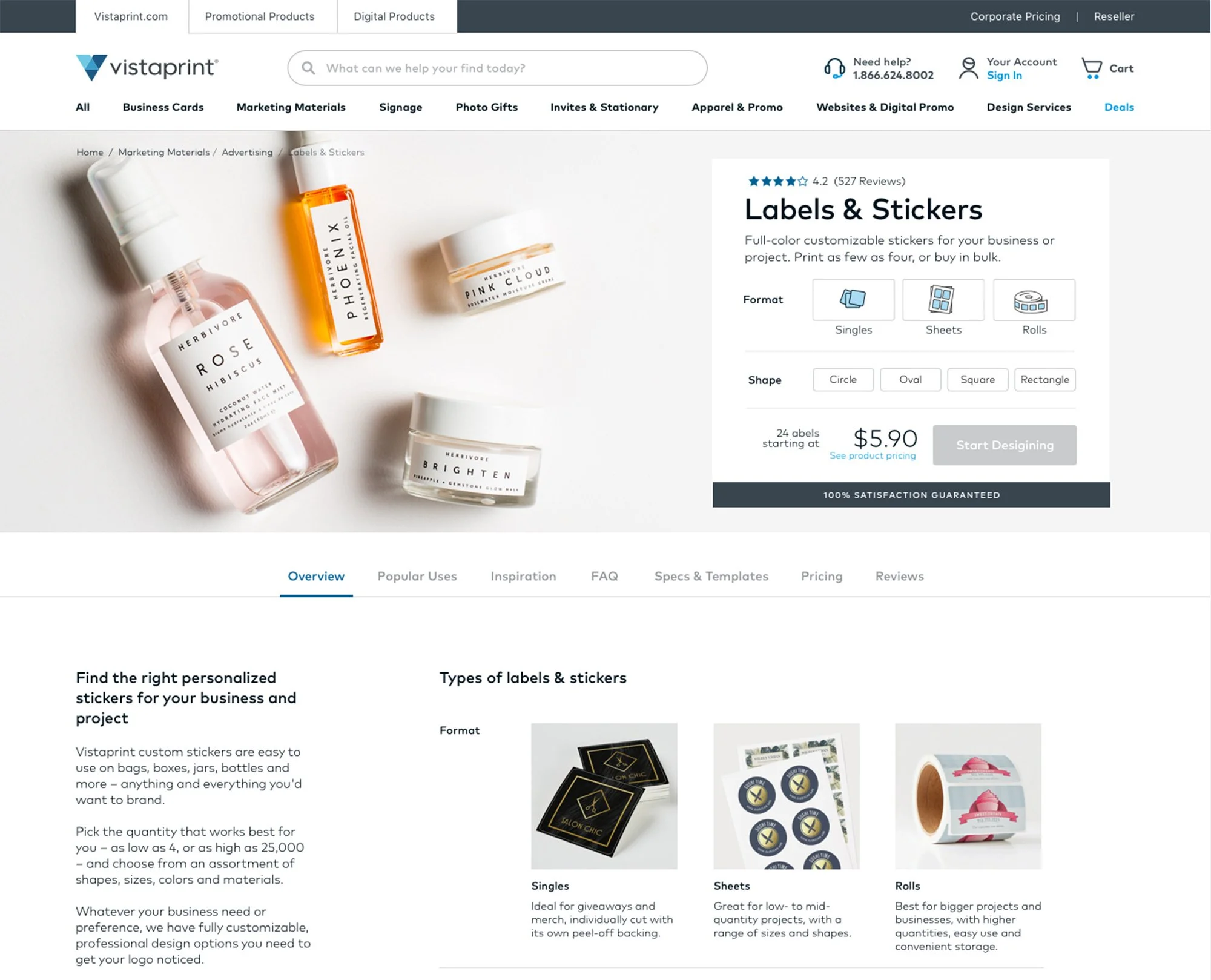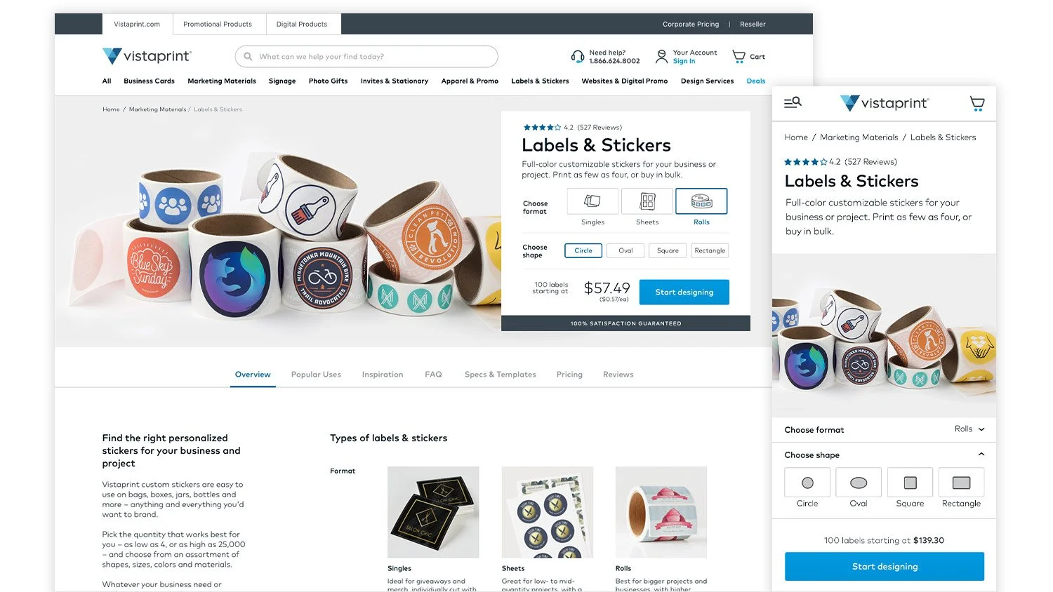 Vistaprint, a pioneer in custom printing for small business owners, wanted to reduce bounce rate by improving the product configuration experience of their Labels & Stickers product vertical. With a low order completion rate of 0.8-9.0% across Labels & Stickers products, how could we retain customers and help them progress to completed orders?
