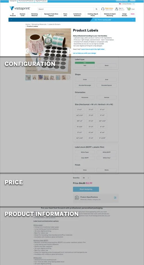 The problem wasn’t necessarily the configuration method. Testing the usability of Vistaprint’s Labels & Stickers and three competitor sites revealed that small business owners responded most positively to the following, which the Vistaprint Sticker flow did not meet: